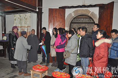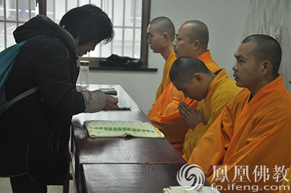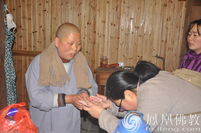 学员给华严洞法师送供养(图片来源:凤凰佛教)