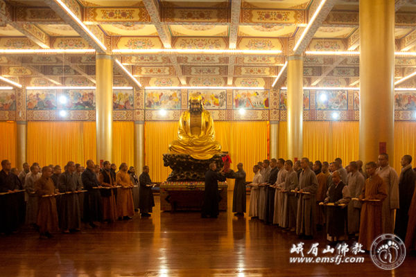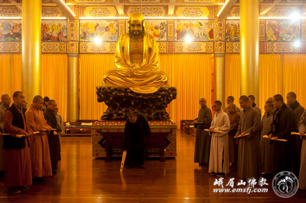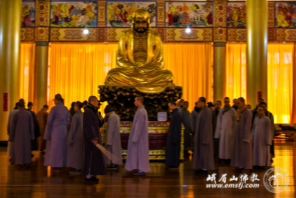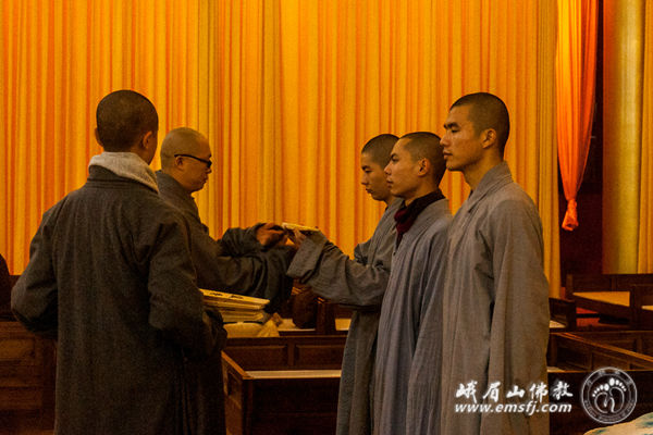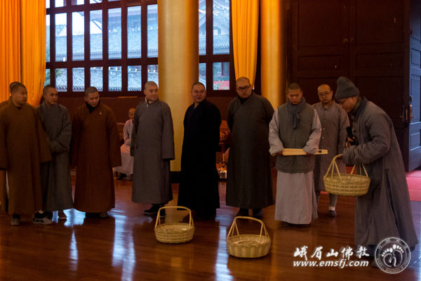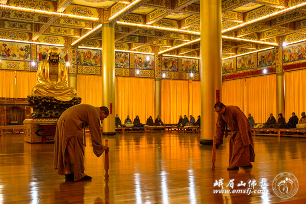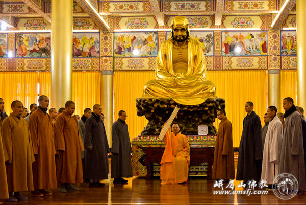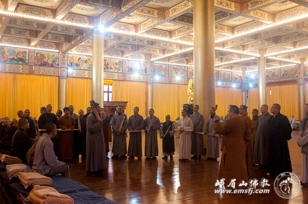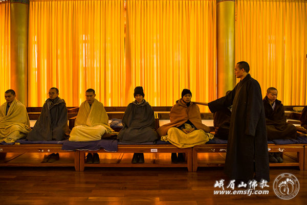 本次禅七从1月3日开始。禅七第一天早上,衍真大和尚亲自指导大众师父演习禅堂规矩,一一讲解早课香、早板香、午板香、晚课香、养息香等各个环节的要点和注意事项,并为大家做示范。峨眉山佛学院女众部也参加了本次禅七演习,认真了解并学习了禅堂规矩。