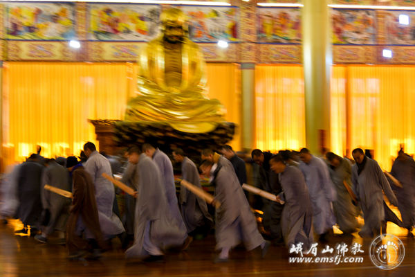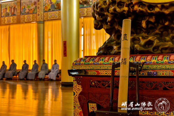 宣说起七法语后,法师将香板头点地,振威一喝:“起!”当值师父打催板,大众师父开始行香,并大声齐呼:“起!”禅七正式开始。