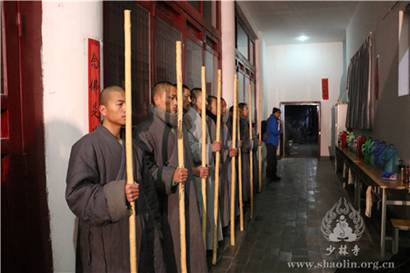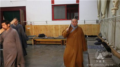 永信法师手持香板“考功”(图片来源:少林寺官网)