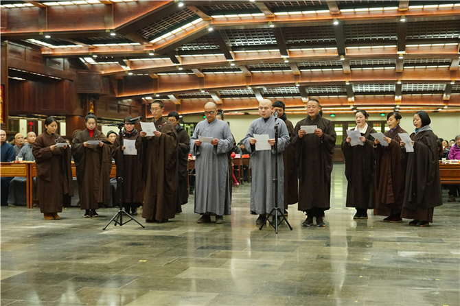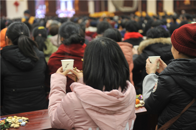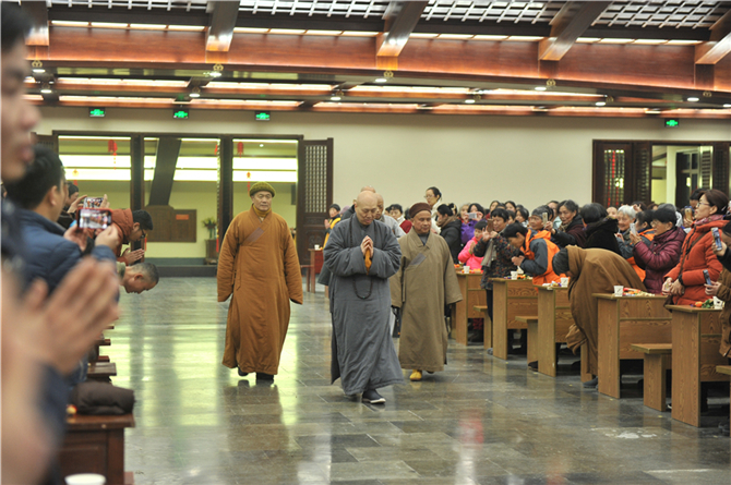 2018年2月15日除夕之夜,庐山东林寺常住僧众、义工以及特别赶来祖庭过年的海内外信众、游客近千人齐聚青莲念佛堂,举行新春普茶会,吃茶、聊工作、听大和尚讲开示。
