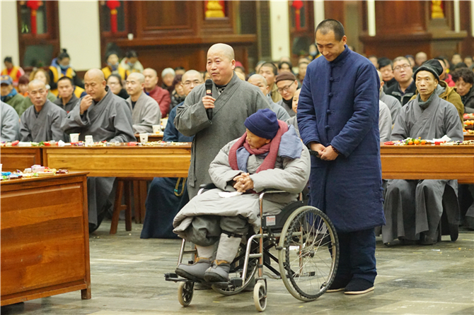 伽陀院负责人宗霖法师推着一位老师父来到现场,老师父已经八十多岁了,修行十分精进,原来经常拜塔,每天都是一句佛号不断,此时他热泪盈眶,借普茶之际,向大安大和尚和各位常住法师表达心中深深的感谢!