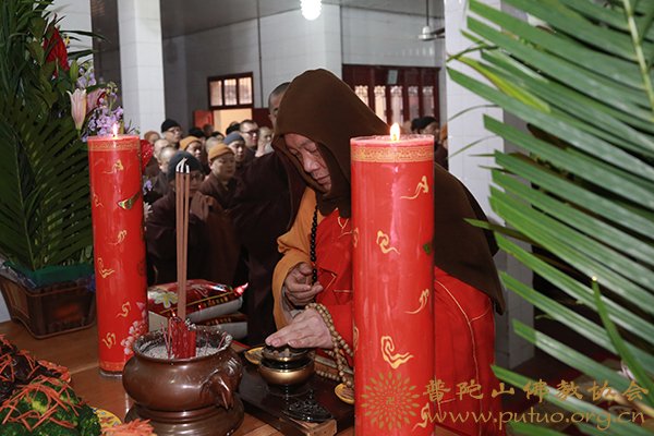 2018年2月8日(腊月二十三小年夜)晚17时,遵循佛教寺院纪念监斋菩萨圣诞的传统,中国佛教协会副会长,普陀山佛教协会会长、普济禅寺方丈道慈大和尚率佛协本部与普济禅寺全体法师于大竂举行监斋菩萨上供法会,并亲自为法会拈香主法。祈祷风调雨顺、国泰民安;道场兴隆、海众安和。法会现场梵音缭绕、庄严肃穆。(文:果宽 图:弘法办)