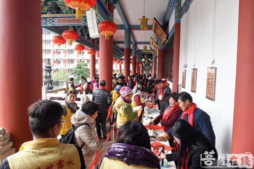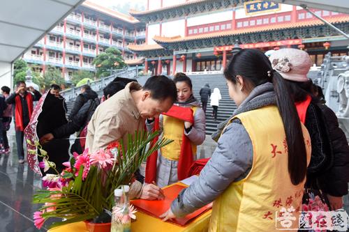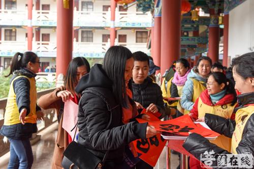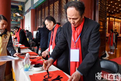 新春来临之际,珠海普陀寺联合珠海市禅文化研究会举办“迎新春·送万福”活动 书法家们走进现场 书法家书写“福”字与广大善信居士、社会各界人士结缘,送上新春的祝福 群贤毕至,翰墨飘香 义工们将一个个福字送到信众的手中 广大民众、善信居士排着长长的队伍 珠海普陀寺果慧法师为书法家们颁发荣誉证书 以笔墨承载祝福,以中华文明展现佛教入世情怀 1月31日,丁酉年腊月十五,在新春来临之际,珠海普陀寺联合珠海市禅文化研究会举办“迎新春·送万福”活动,邀请著名书法家书写“福”字与广大善信居士、社会各界人士结缘,送上新春的祝福。 12时30分,广大民众、善信居士于五时宝殿法堂前排起长长的队伍。三十余位广东省著名书法家在大众的期待之中,蘸墨挥毫。 群贤毕至,翰墨飘香。书法家们热情高涨,笔走龙蛇,一个个喜庆的“福”字跃然纸上,散发着清新的墨香。义工们将一个个福字送到信众的手中,更有信众请书法家写“寿”字、“招财进宝”、“大吉大利”等祝福语。 15时,活动接近尾声,每人手中都捧着喜庆祥和的“福”字红纸,脸上洋溢着新春的喜悦。一份份佛门祝福温暖人心,更随着一个个“福”字走进千家万户。 以笔墨承载祝福,以中华文明展现佛教入世情怀。珠海普陀寺弘扬佛教慈悲精神,传承中华优良传统,造福社会,利乐有情。祝愿世界和平,国家昌盛,广大民众,新春吉祥,福慧增长,道业增进,善愿圆满。