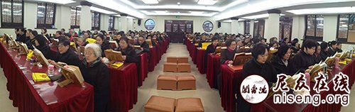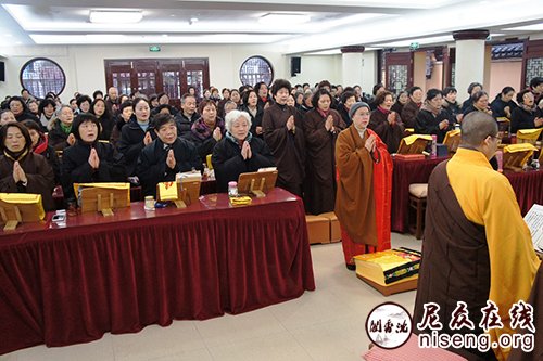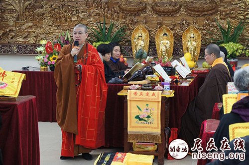 上午7时45分,法会正式开始,沉香阁住持定慧法师拈香,并作了简单开示:“《楞严经》是一部极其重要的大经,可说是一部修行大全。在修行上指示由凡到圣,从发心到信、解、行、证的修行次第。楞严经是众魔的克星,是破魔的大法宝,此经以佛陀堂弟阿难即将堕入摩登伽女,而佛陀示以破之为例,指出我们学道成佛、战胜阴魔的重要性。尤其是我们末法时期种种法上的乱相,佛在本经中,指出其各个对治之方法。若有本经住世,则正法住持世间,佛弟子修行有所依持,邪魔即不能得逞。《楞严经》是末法时期众生修行不可缺少的一部宝典,依此宝典,末法众生方可于此正法得正知、正见、正信、正行,而不被种种邪魔外道所转、所诳惑、破坏。因此,作为佛弟子应善护正法,勿谤此经,共同宣扬此法门,菩提道上种诸善根因缘”。最后,定慧法师祝愿各位信众身心自在、福慧增长、佛光普照、法喜充满!