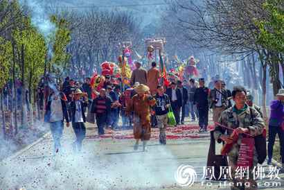 中午12:30分,普光明殿前,鼓乐齐鸣、龙腾狮跃,穿着五彩缤纷各式各样民族盛装,从四面八方赶来的信众载歌载舞,热烈庆祝巡佛仪式开始。四尊太子佛由宝泉寺侧门而出,沿街而行,每家每户都会在自己家门口陈列香案,长跪虔诚礼拜祈祷,并燃放鞭炮把佛(福)留住,直至佛像远去,方起身回家,准备入寺礼佛。巡佛归殿后,监院传轮法师带领大众礼佛诵经,祈愿世界和平、国泰民安、风调雨顺、五谷丰登。