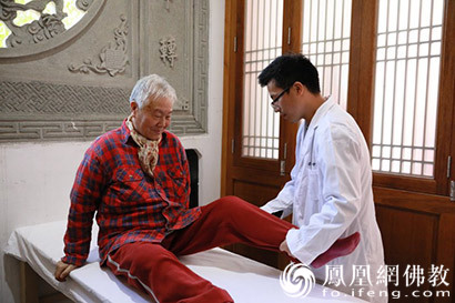 义诊医生现场帮病患推拿(图片来源:凤凰网佛教 摄影:慧德)
