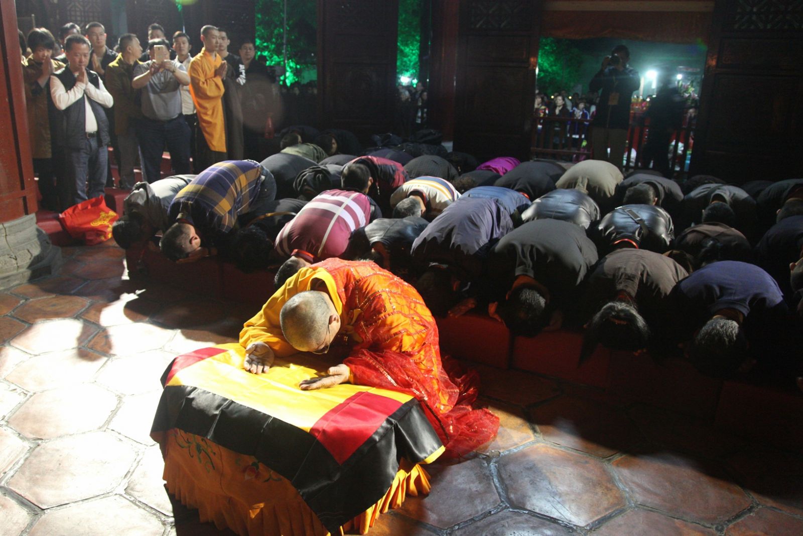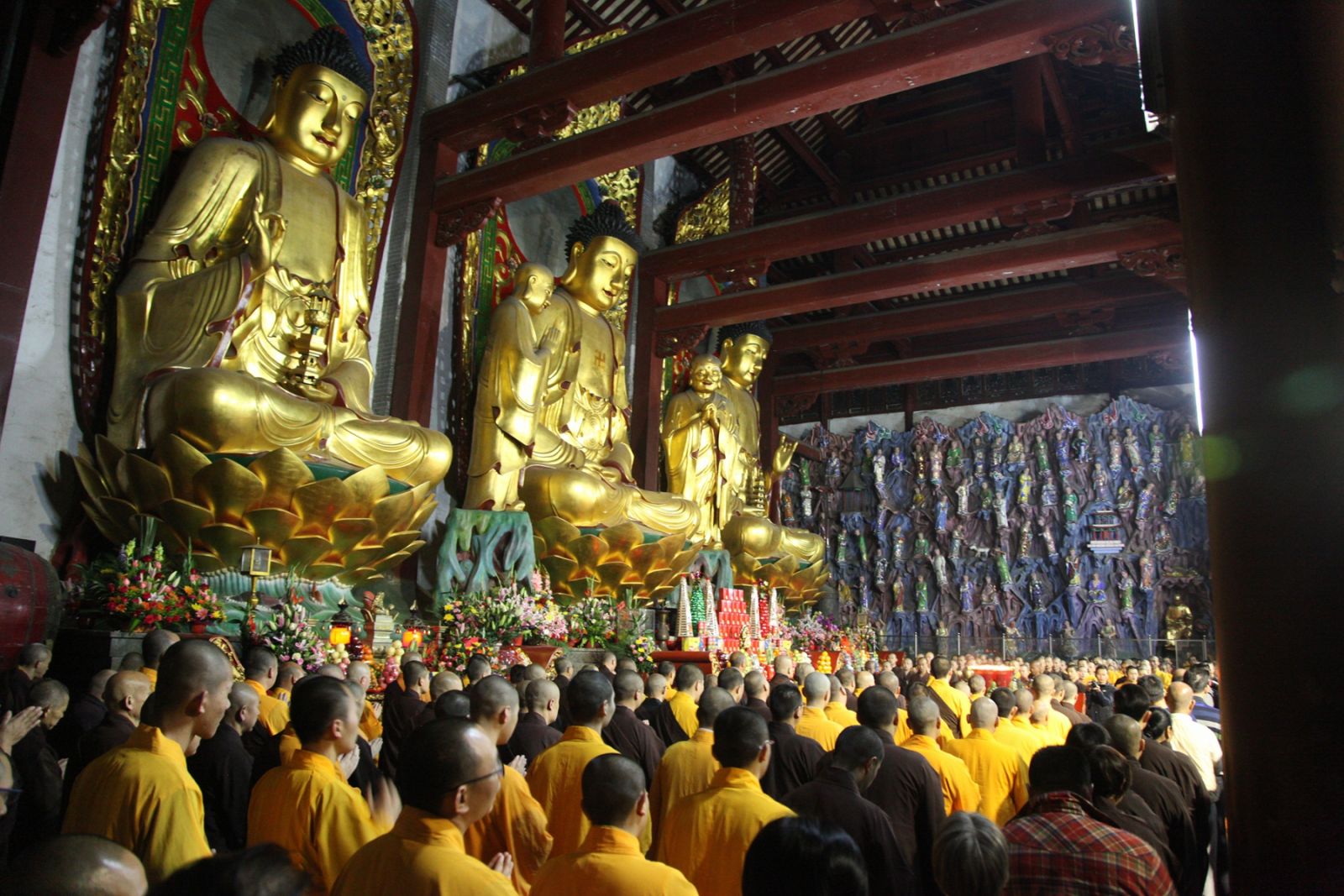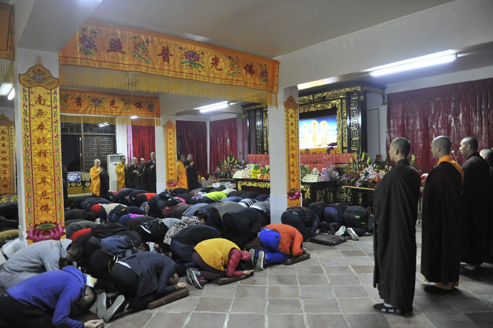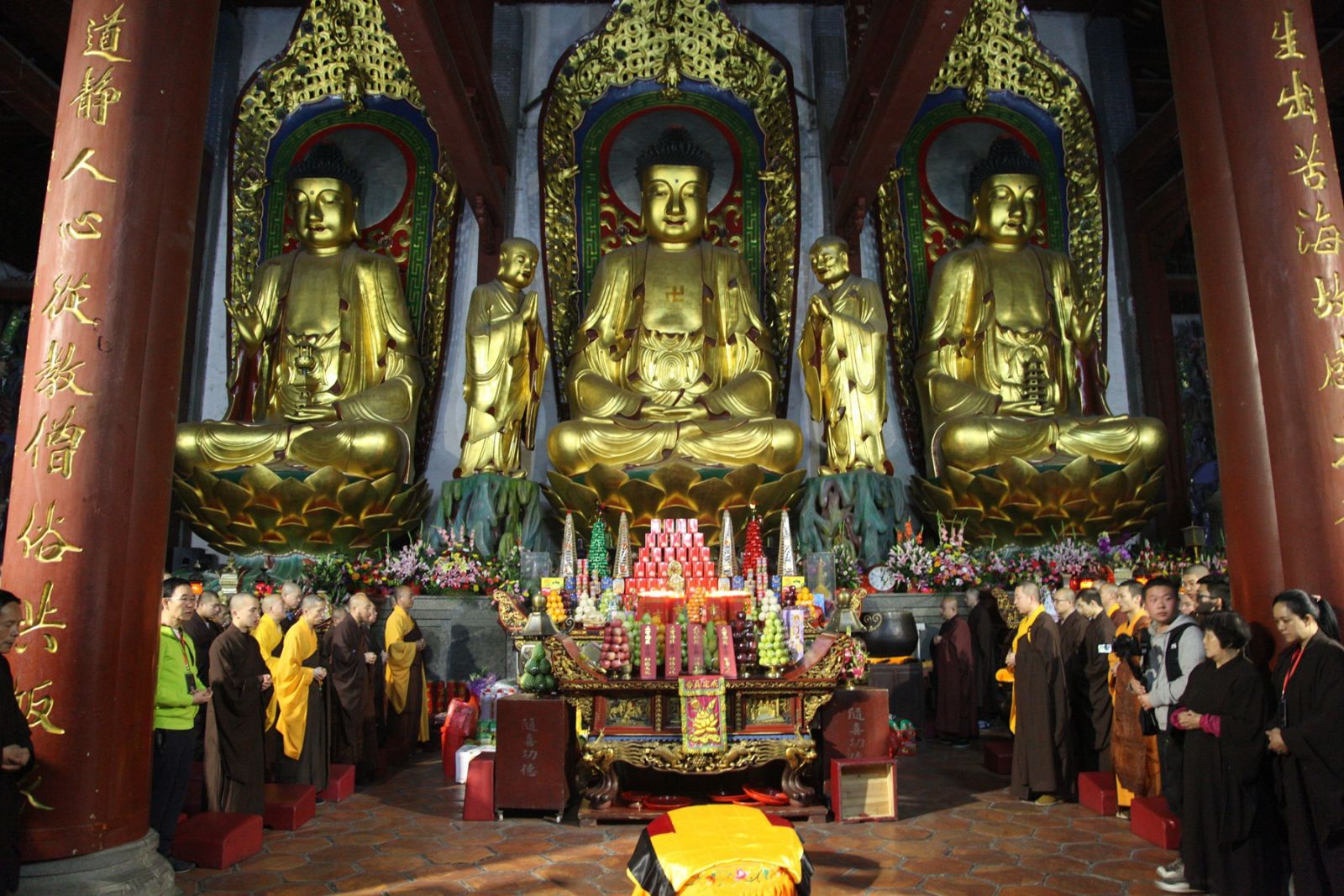 大雄宝殿内,三尊大佛庄严肃穆,四众弟子于佛前依次排班,由方丈传正大和尚亲自主法,率众至诚顶礼,唱诵经典。