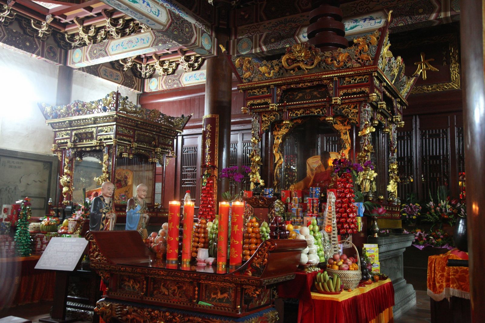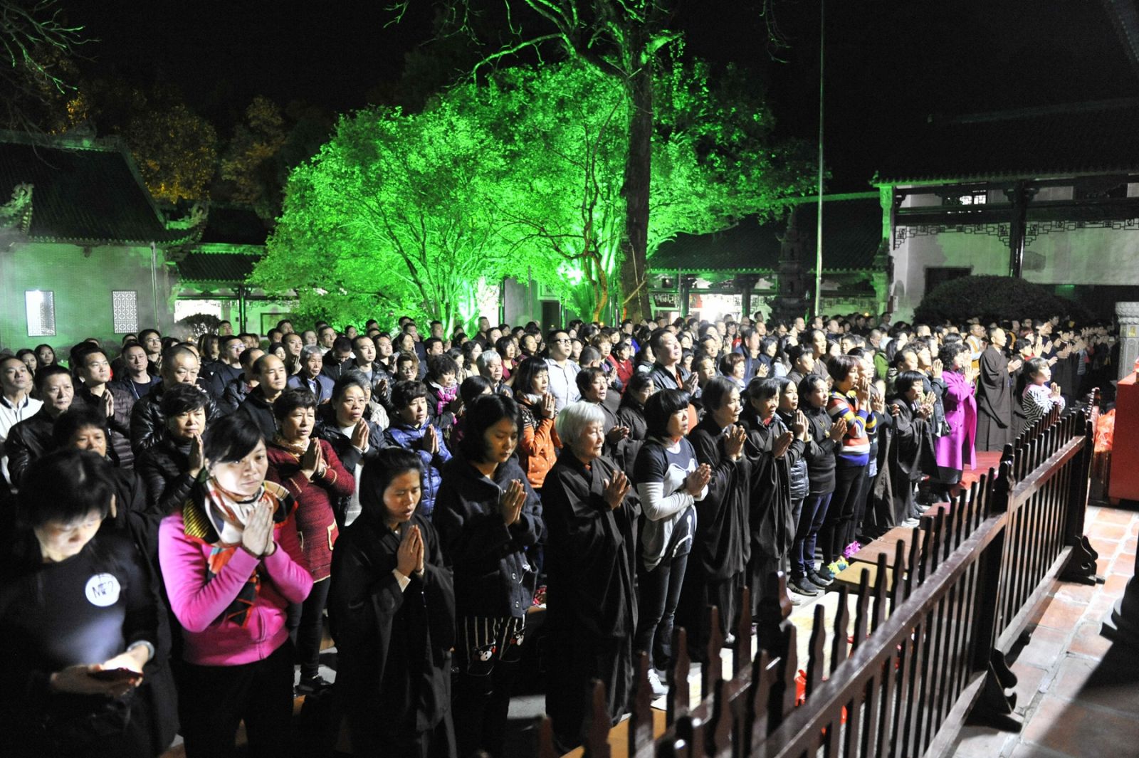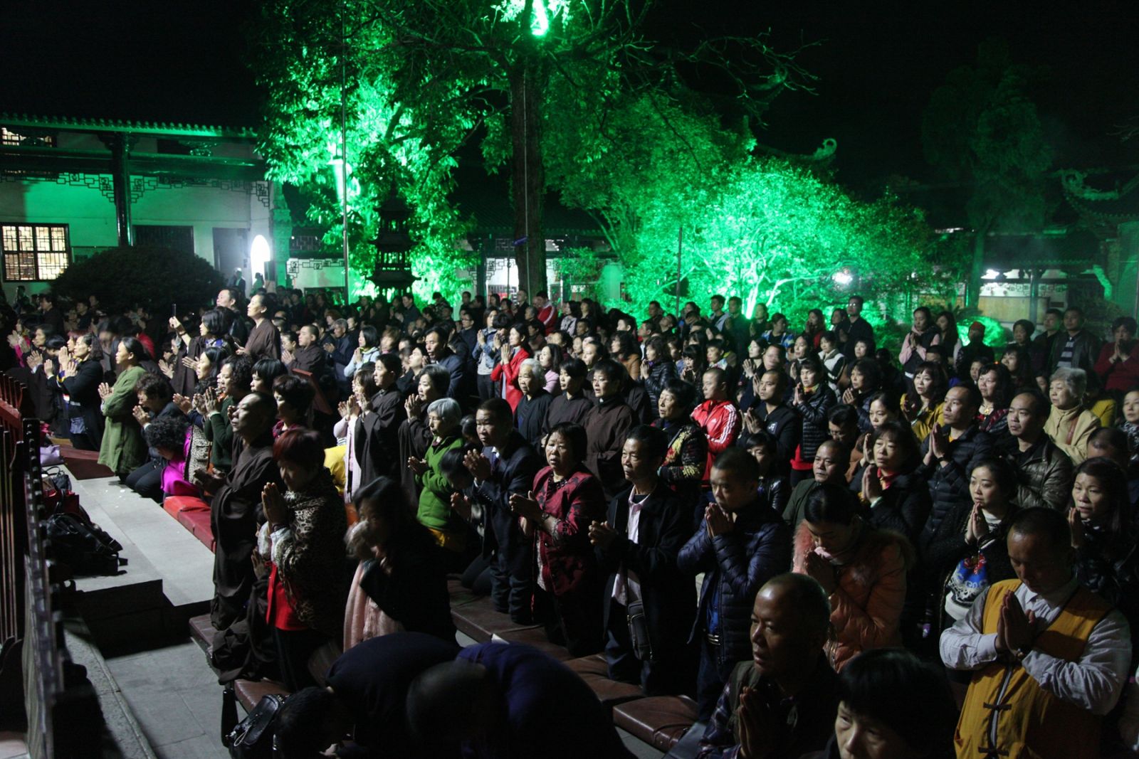 凌晨四点,浑厚的钟声划破漆黑的夜空,南华禅寺内已是一片灯火通明。从各处赶来的善信纷纷在大雄宝殿外安静驻足,静待祈福法会的开始。