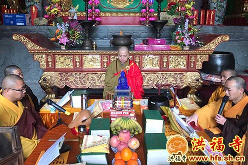 本寺住持圣怀法师拈香主法,诵偈观想。与会法师一同诵大悲咒,加持杨枝净水,并祈愿国泰民安、风调雨顺。