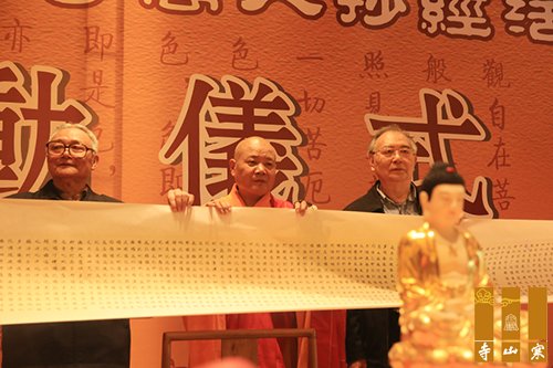 抄经结束后,秋爽大和尚开示:当代,科技发达。大众因电脑之方便,书写量急剧下降。抄经不仅可以传承中华民族优秀的文化,而且用毛笔一笔一划抄写佛经可以获得心灵的洗礼,让人慢慢静下心,放下烦恼。今后寒山寺将扩大抄经规模,让更多人继承中华民族优秀文化。