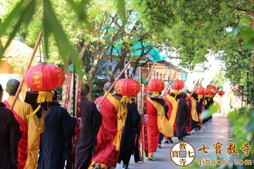 下午2时许,外坛的法师、功德主,在大雄宝殿前持幡把灯,两序排班,仪仗整齐,庄严肃穆。寺内管乐齐鸣,锣鼓喧天,众法师引领,众善信紧随其后,由内坛缓步行至大坛,诵经、礼拜、回向,在念佛引导声中,送圣队伍提炉持幡,齐心恭送十方法界,诸佛菩萨圣众请登云路,六道圣凡并诸眷属往生极乐净土。