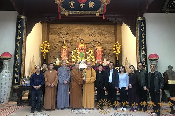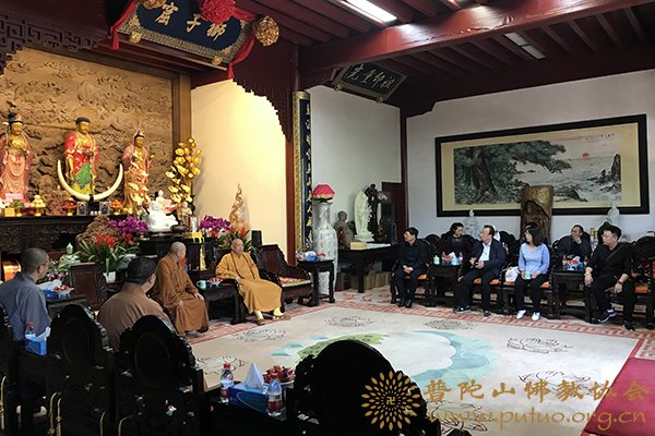 2018年4月19日上午,山西省佛教协会副会长、大同市佛教协会会长妙真大和尚,山西省大同市民族宗教事务局局长杜福等一行11人参访普陀山。中国佛教协会副会长、普陀山佛教协会会长、普济禅寺方丈道慈大和尚在普济禅寺方丈殿热情接待了参访团一行,并进行了亲切友好交谈。