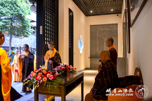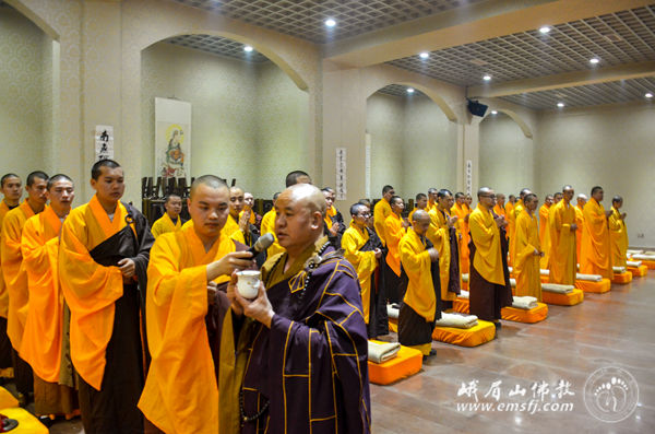 在行愿堂,维那师领大众持诵《杨枝净水赞》,本昌大和尚拈香礼佛。大众唱赞毕,法师手执净水杯说水文,并以柳枝洒净。