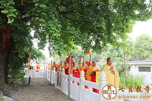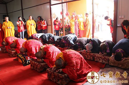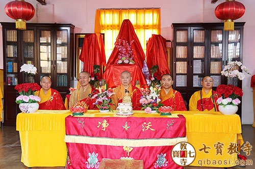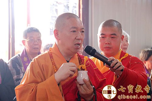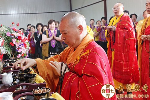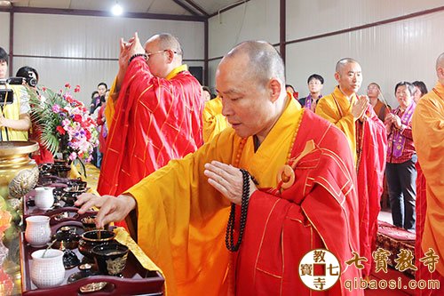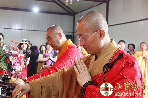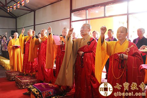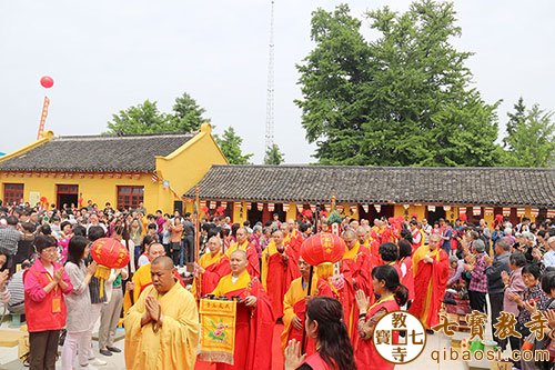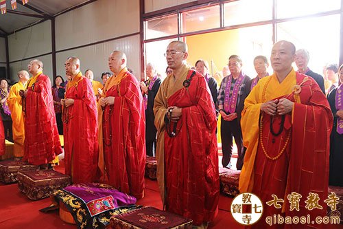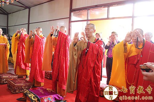 上午9时30分,两序大众至诚迎请上海市闵行区佛教协会会长、七宝寺方丈慧平大和尚;上海市佛教协会副秘书长、宁国禅寺方丈平熹大和尚;美国洛杉矶妙觉寺住持心园法师;上海市闵行区佛教协会副会长、大圆通寺住持慧莲法师;上海市闵行区佛教协会副会长、省殿禅寺住持相玉法师五位主法法师至念佛堂主法开光。