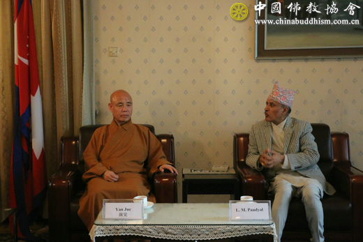 2018年4月30日上午,中国佛教协会副会长演觉法师受邀出席尼泊尔驻华大使馆佛诞节庆祝活动。图为演觉副会长会见尼泊尔驻华大使利拉•马尼•鲍德尔
