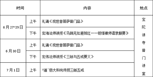 法会期间将请中国佛教协会副会长、普陀山佛教协会会长、普济禅寺方丈上道下慈大和尚为大众传授三皈五戒。
