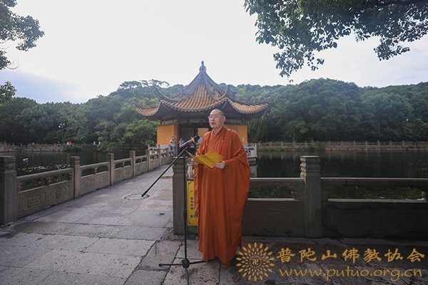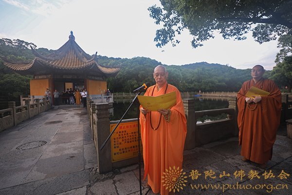早上6时,升国旗仪式正式开始。中国佛教协会副会长、普陀山佛教协会会长、普济禅寺方丈道慈大和尚,舟山市委统战部副部长、市民宗局副局长陈宏成,普陀山管委会党委委员,市纪委、市监委驻委纪检监察组组长余忠恩,佛协副会长惟航法师、净旻法师、智宗法师、门肃法师(兼秘书长)、会闲法师、定明法师,全山各寺院监院等出席,及佛教协会会本部、普济禅寺两序大众共约200余人参加升国旗仪式。仪式由净旻法师主持。