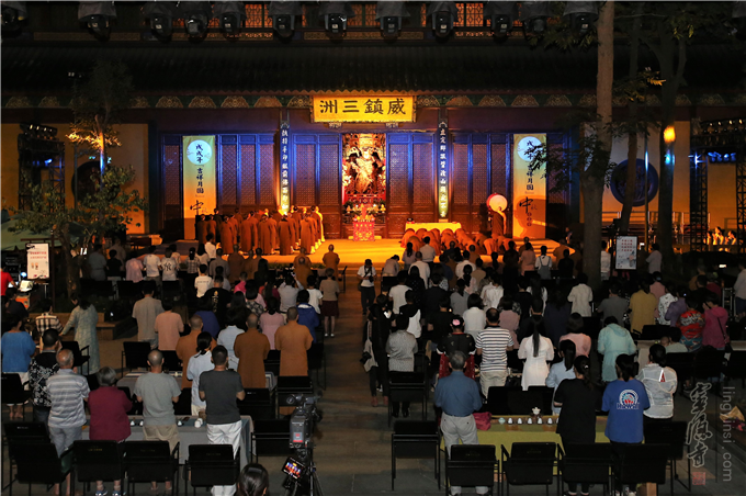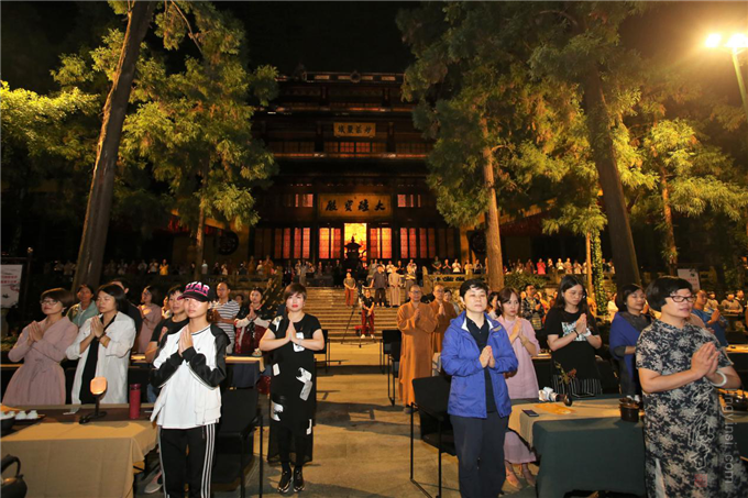 大众依照佛教仪轨,随维那师一起唱念《药师咒》《月光菩萨赞》等,在月光中拜愿祈福,祈愿菩萨月光遍照,国泰民安,寰宇清凉。祈愿有情众生,除去障难,成就善法。现场观众全体起立,跟随法师们一起参加拜月仪式。