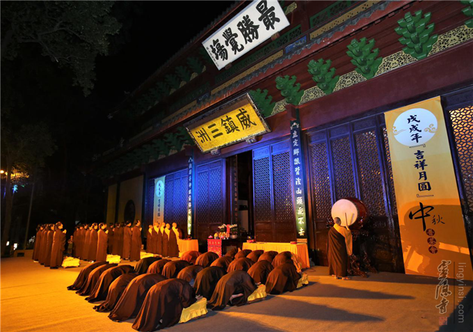 2018年9月24日中秋之夜,玉露生凉,银蟾光满,杭州灵隐寺举行中秋普茶晚会。灵隐寺全体常住法师、各堂口职工以及来自社会各界的护法居士等三百余人齐聚大雄宝殿前广场,拜月祈福,聆乐品茗,祝福祖国,共庆团圆。