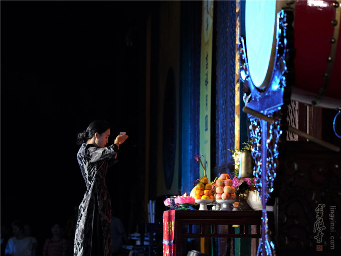 檀香馥郁,钟磬清扬。月光菩萨有悲天悯人之怀,具澄明天地之力,虔诚礼拜月光菩萨,可入琉璃之境,远离种种欲染。云林志工和护法居士在法师的带领下,设香花灯果等供养,礼拜月光太阴尊天菩萨。