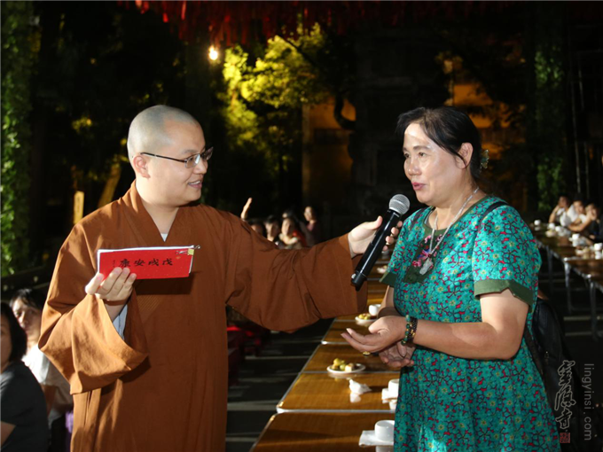 佛教说:“入宝山,不能空手而归”。普茶晚会特别设置了佛教知识有奖互动问答环节,只要回答对问题,就能携“宝”而归,得到方丈和尚特地准备的礼物。灵隐寺大雄宝殿盖印处有两枚印,一枚是“三宝印”,还有一枚是“法水长流印”。与会大众在抢答题目的过程中,亲近佛法,无限赞叹。