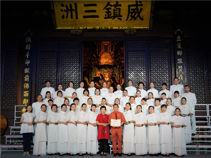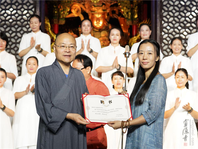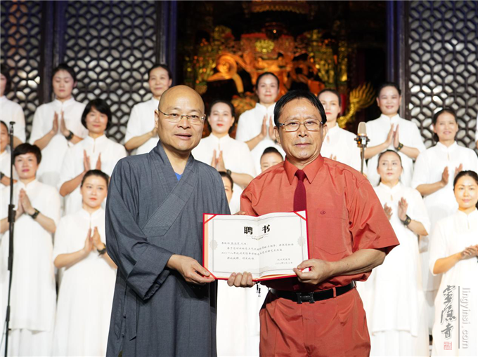 在中秋普茶晚会上,杭州灵隐寺聘请国家一级演员、著名歌唱家张承军老师担任云林志工艺术团艺术总监;聘请陈绿芳老师担任云林志工团茶修组导师。灵隐寺方丈光泉大和尚上台给他俩颁发聘书。
