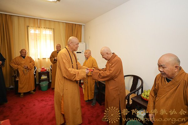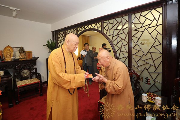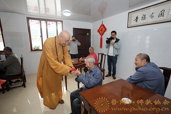 2018年10月13日,重阳佳节日渐临近,中国佛教协会副会长、普陀山佛教协会会长、普济禅寺方丈道慈大和尚,普陀山佛教协会副会长兼秘书长门肃法师,副会长定明法师等一行先后前往佛教颐养堂(杨枝禅林、常乐禅院)及本山地方敬老院慰问全体老人,并送上节日祝福。