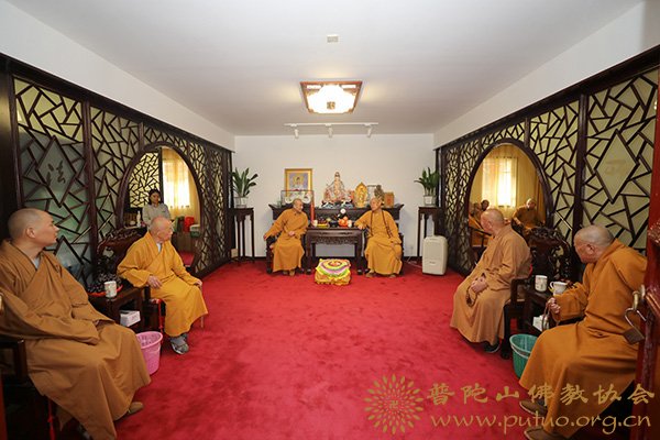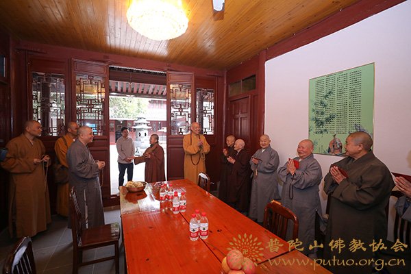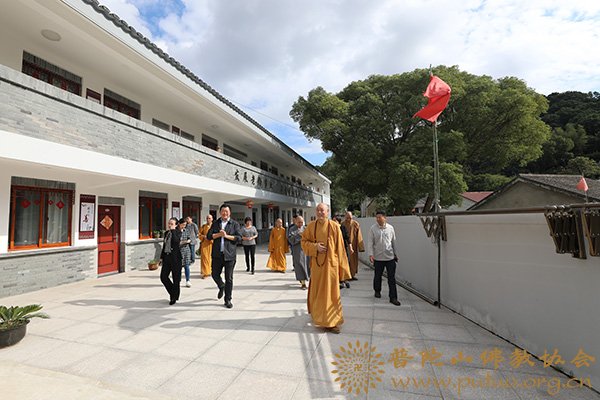 普陀山-朱家尖管委会党群工作部副部长卢启良,普陀山佛教协会副秘书长兼办公室主任昌智法师,弘法办主任寂戒法师,办公室副主任孙波居士等陪同。