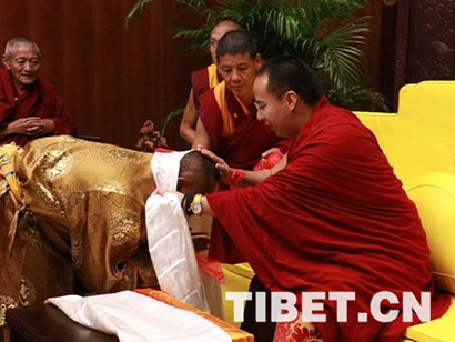图为参加论坛的藏传佛教界活佛拜见十一世班禅(图片来源:中国西藏网)