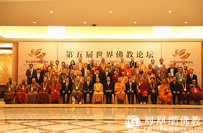 尤权与参加第五届世界佛教论坛的部分代表合影留念(图片来源:凤凰网佛教)