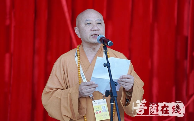 中国佛教协会副会长明生法师在致辞中对承办此次图片艺术展付出了辛勤努力的各方表示感谢(图片来源:菩萨在线 摄影:妙雨)