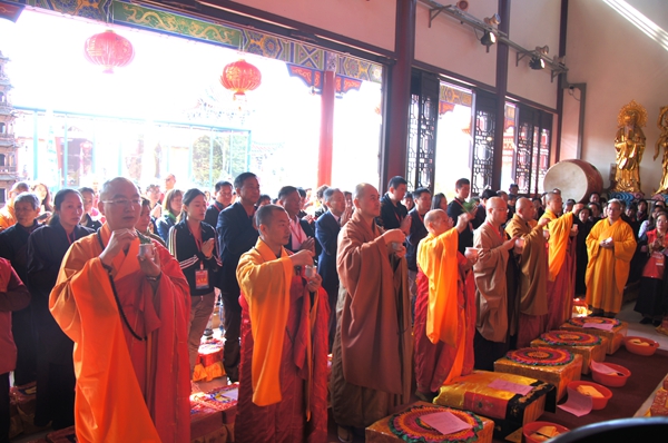随后,开光法会正式开始,大初法师、传静法师、朗明法师、心融法师、性空法师等共同主法,主法法师拈香、说法,杨枝甘露,遍洒清净道场,唱诵经咒,顶礼十方常住佛法僧三宝。用巾拂尘,举镜照空,朱笔点眼, 在阵阵梵音、祝福声中,法喜充满,庆典圆满结束。