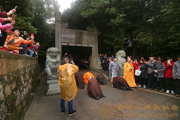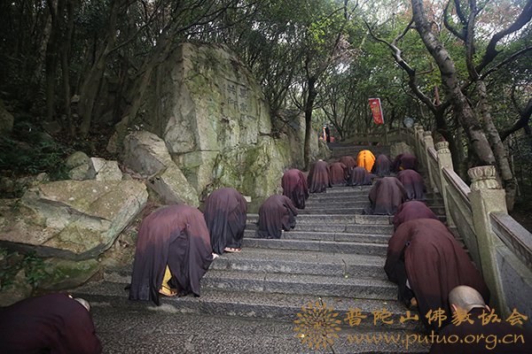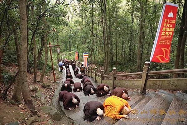 普陀山作为中国佛教四大名山之一,历来注重道风建设,每年都会组织全山僧众引领信众三步一拜朝礼佛顶山,以忏除业障、坚固道心,是从山下拜到山顶,从古道拜到殿堂,从无明拜到光明的修学历程。(