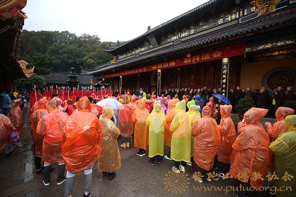 2018年11月8日(农历十月初一),法雨频施,慈云普覆。第十六届中国普陀山南海观音文化节系列活动之一的“僧众礼佛顶、万信齐朝拜”法会隆重举行。上午7时许,全山各寺院的僧众、护法居士、以及来山的香游客千余人齐聚法雨禅寺大雄宝殿前,朝拜法会正式拉开序幕。普陀山佛教协会副会长、法雨禅寺监院信光法师主持法会。