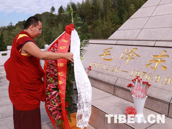 十一世班禅表示,只有在中国共产党的领导下,全国各族人民才能享有幸福生活,相信在党中央正确领导下,中华民族伟大复兴的中国梦一定能早日实现。图为十一世班禅向毛主席像敬献花圈和哈达,深切缅怀老一辈革命家的丰功伟绩。