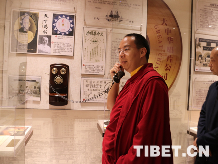 在中国唱片博物馆,工作人员播放该馆珍藏的西藏音乐唱片,十一世班禅听到后立刻认出来并说:“这是土登啦的声音。”图为十一世班禅在听孙中山先生仅存的演讲录音。