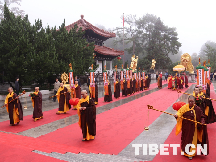 11月2日至6日,十一世班禅先后到南普陀寺、平兴寺、永乐寺、涌泉寺礼佛。图为天心永乐禅寺僧人仪仗队提灯持炉迎请十一世班禅入寺。