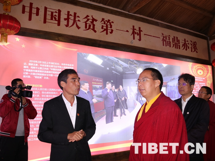 11月3日,十一世班禅在福鼎市考察中国扶贫第一村——赤溪村。图为十一世班禅参观赤溪村展示厅。