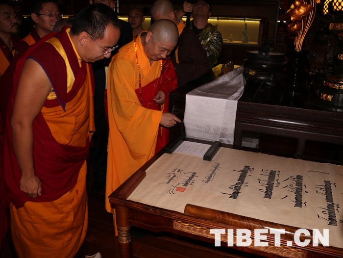 图为十一世班禅在南普陀寺瞻礼十世班禅的藏文题词。题词内容为:佛光普照三界世,众生苦海渡彼岸;普陀山门升平象,海峡骨肉思相连。