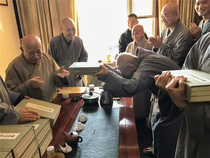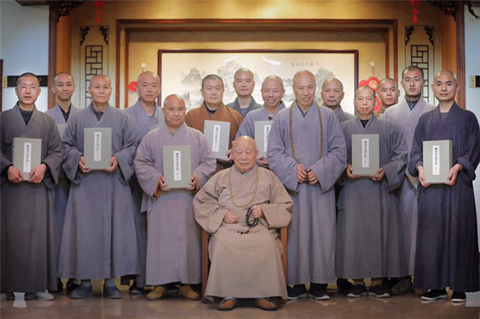 最后,传印长老亲手为在场的每一位班首执事赠送亲笔书写的宣纸印刷精装版《古德净土诗信钞》,并合影留念。诸位班首执事,无不法喜充满,信心倍增。