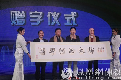 中国首届世界佛教论坛宣言书写者、著名书法家童英强赠字《翡翠弥勒大佛》(图片来源:凤凰网佛教 摄影:林恩)