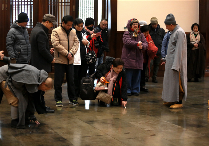 当踏入香光讲堂时,参访团成员发现这里的地板有些非比寻常,经过仔细打量,发现是中国传统窑砖烧制业中的珍品——金砖,不由感叹东林寺的建筑所蕴含的丰富而深厚的传统文化底蕴。德雍法师为参访团介绍了制作金砖的详细工序及其用途优势,因为金砖质地坚细,不同于普通水泥地板的粗糙,适合念佛行人长时间的经行。