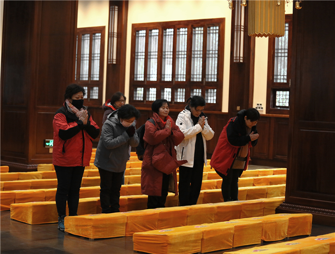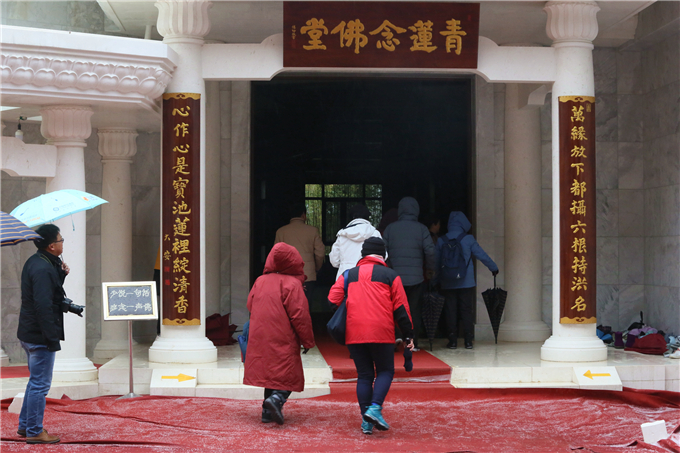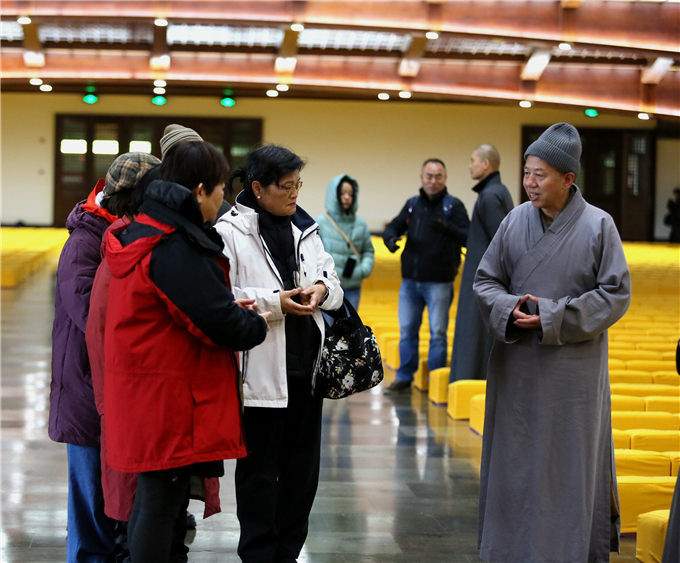 参访团一行先来到青莲念佛堂,看到这样香光庄严而辉煌的殿堂,参访团成员啧啧赞叹不已。因正值佛七午休时间,无缘目睹和体验东林佛七,他们感到很遗憾。部分参访团成员对东林佛号慕名已久,很想了解具体唱法及相关要点,对此德范法师一一给予详细解答,并在客人要求下现场演示如何唱念东林佛号,参访团员纷纷拿出手机拍摄视频作为以后的学习资料。