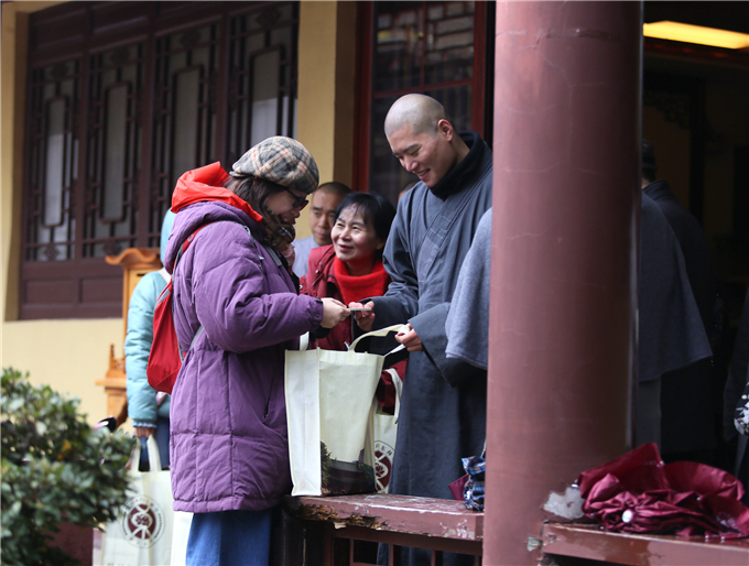 最后,参访团一行来到客堂,三位法师代表东林寺常住给每位参访团员结缘了一份礼品——东林寺主要法宝,希望今后赣台媒体界之间能够有更多的交流学习机会,共同为佛教事业奉献自己的一份力量。