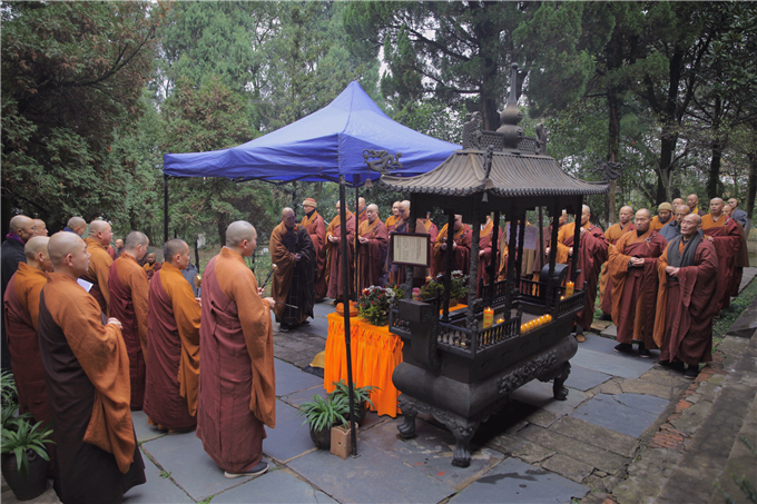 扫塔仪式依次从远公塔院、果公塔、圆华首座塔、海会堂、佛驮跋陀罗尊者塔院及往生堂处进行扫塔拜祭,在维那师父的引领下,讽诵经咒和唱赞。