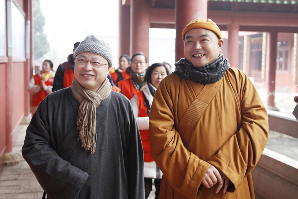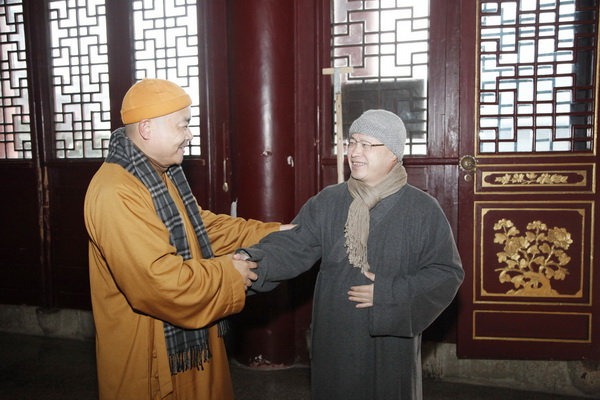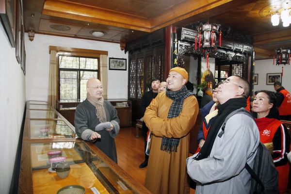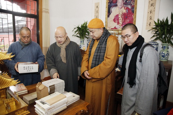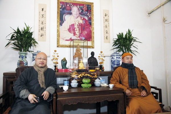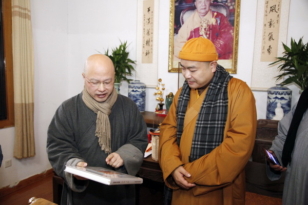 两位大和尚随后在纪念堂会客室进行了亲切的交流。宽静大和尚首先介绍了“一国两制”制度下佛教在澳门繁荣发展的情况,大和尚说:“香港和澳门佛教的发展永远离不开内地,离开了内地就失去了历史和文化传承,内地佛教就是我们的根、就是我们的靠山,所以每年都要经常组织澳门的信众像这次一样回内地来朝山礼祖。”宽静大和尚还介绍了澳门的社会发展和风土人情,在谈到曾有过被殖民历史的澳门拥有诸多西式建筑时,明基大和尚感慨道:“葡萄牙建筑和东方建筑各有各的特点和美感,但是作为我们东方人来说,在传统文化影响下形成的建筑风格显然更能从心理和文化上让国人认同与亲近。在现代建筑非常普遍的今天,寺院还保留了中国传统的建筑样式,也希望社会大众都能有机会来看一看。”