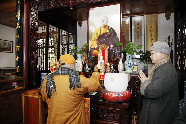 大家来到净慧长老纪念堂后依次在长老法相前上香、瞻礼长老舍利并观看了《生活禅者》纪录片和长老开示。
