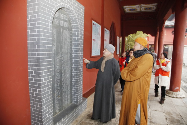 明基大和尚与宽静大和尚见面后一同回忆起了往昔见面时的场景,随后带领大家参观了四祖殿,并着重向大家介绍了四祖寺法脉传承以及寺院周边文物等情况。