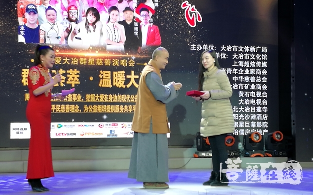 是日,文慧法师与来自三省两市群星和众多企业家、爱心人士,不畏严冬的寒冷,齐聚大冶市文化馆,举行“大爱大冶”慈善演唱会,共同为因白血病复发的余镡宇小朋友度过难关,伸出爱的援助之手。
